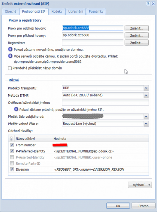 Je potřeba nakonfigurovat správný obsah SIP hlaviček.