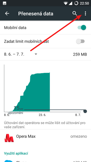 Vidíme celkové množství přenesených dat přes mobilní připojení za zvolené období i množství dat přenesené jednotlivými aplikacemi.